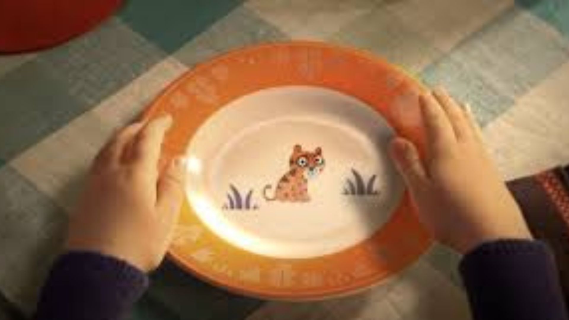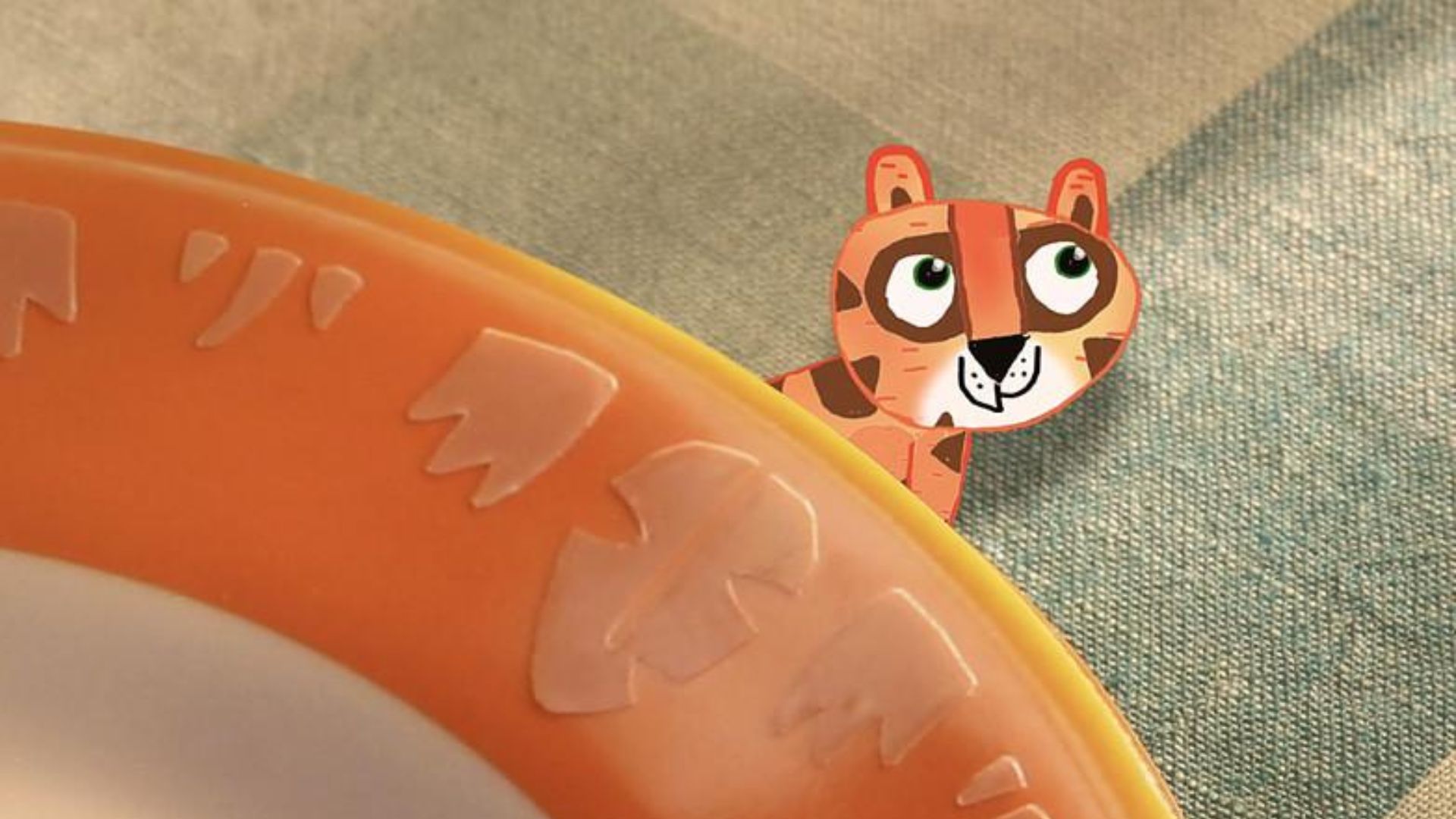 Tijger. Op een voedselbord wordt een vrolijke kleine tijger afgedrukt. Maar als je hem met rust laat en hij niets te eten op zijn bord kan vinden, gaat hij langs de lunchtafel reizen om zijn eetlust te stillen.
